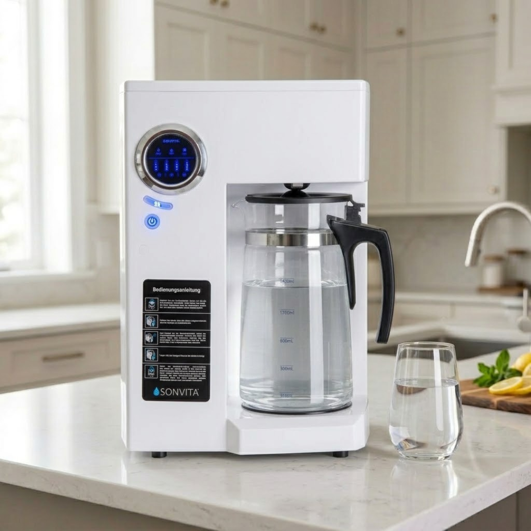 Die Auftisch-Anlage Aqua Vita ähnelt nicht nur vom Design her einer Kaffeemaschine, sondern auch von der Funktionsweise: Leitungswasser in den Tank füllen, kurz warten und das Ergebnis genießen - keine Installation, keine Montag! Die Anlage wird nicht an die Wasserleitung angeschlossen.