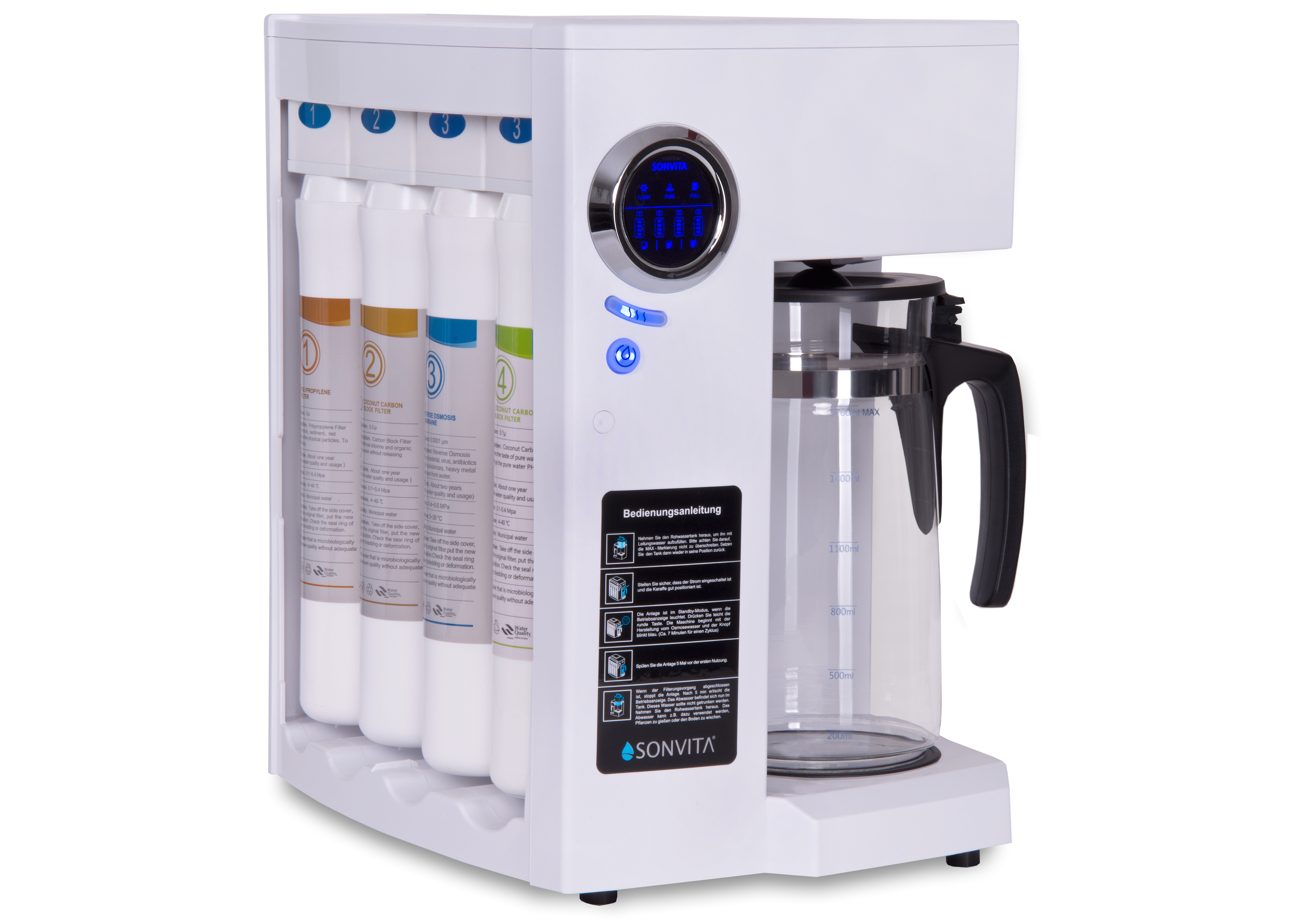 Die Extras machen die Handhabung ganz besonders Durch die besonderen Extras, wie die schöne, hochwertige Glaskaraffe sowie der beleuchtete LCD Bildschirm, wird die Nutzung der Aqua Vita zum besonderen Erlebnis.