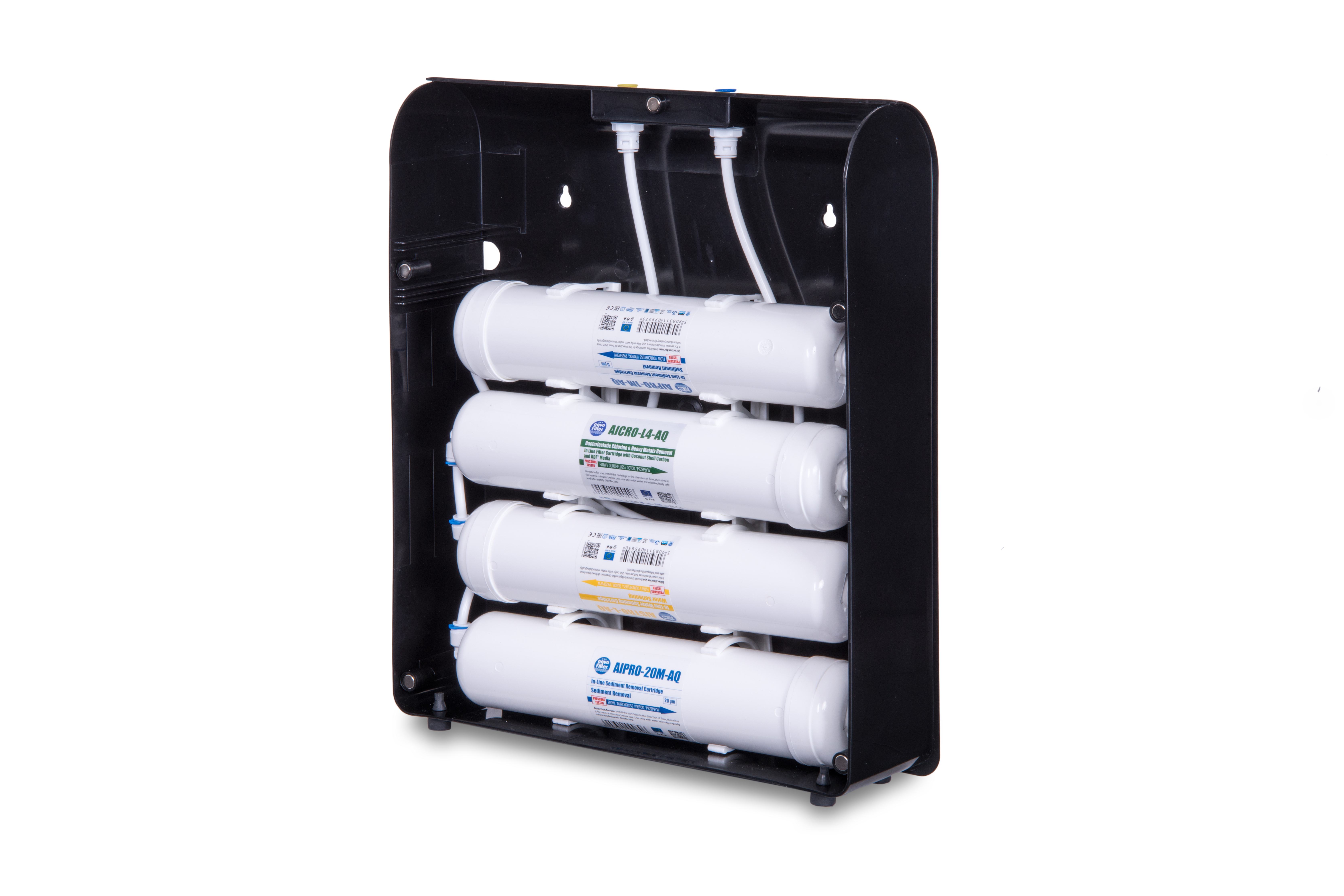 - Filterstufen: Vorfilter, Enthärtung, Aktivkohle mit Spezialmedien, Mikrofiltration