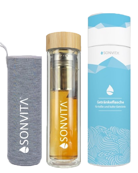 Diese elegante Trinkflasche aus doppelwandigem Glas und Deckel aus Bambus ist ideal für heiße und kalte Getränke. Dank des herausnehmbaren Teesiebs aus Edelstahl eignet sie sich perfekt für losen Tee, Infused Water oder aromatisiertes Wasser. Die beiliegende Stoffhülle bietet zusätzlichen Schutz und Komfort für unterwegs.