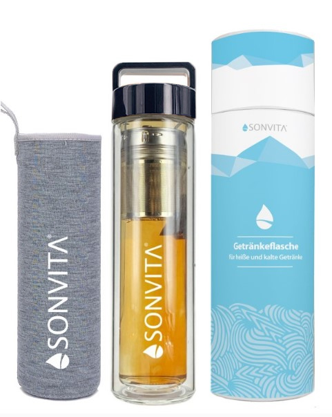 Diese elegante Trinkflasche aus doppelwandigem Glas und schwarzem Deckel ist ideal für heiße und kalte Getränke. Dank des herausnehmbaren Teesiebs aus Edelstahl eignet sie sich perfekt für losen Tee, Infused Water oder aromatisiertes Wasser. Die beiliegende Stoffhülle bietet zusätzlichen Schutz und Komfort für unterwegs.